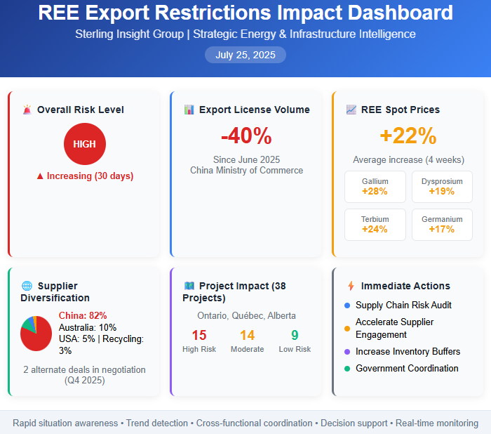 Provide executives and strategic planners with a real-time, at-a-glance situational overview of the evolving rare earth element (REE) supply risk posed by Chinese export restrictions. The dashboard consolidates key indicators, risk levels, supply chain status, and actionable intelligence to support rapid assessment and decision-making.